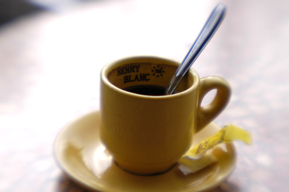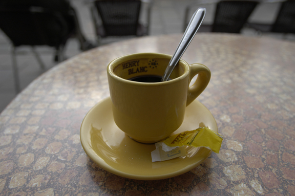 Hrm. The tiramisu della casa is in a plastic cup and the waitress just peeled the lid off of it. Shades of Henry's all over again. Hrm. And frost crystals on top. Maybe pre-packaged, semi-frozen tiramisu in Milan is better than pre-packaged semi-frozen tiramisu in the states. But still, it's pre-packaged, semi-frozen tiramisu. Hrm. Passable. Nothing to write home about. C;est la vie. Wait. That's French. And the coffee. Savoring it. Aside fro Malpensa, the last I'll have for a while.